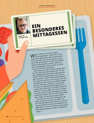 Eines Tages hat meine Lehrerin gesagt, dass wir zwei neue Mitschüler bekommen. Ich war sehr aufgeregt! Als die beiden Jungen das erste Mal in die Schule gekommen sind, hab ich gleich geholfen, dass sie alles Material bekommen, was sie brauchen. Ich wusste ja noch, wie schwierig es in den ersten paar Wochen gewesen war, Freunde zu finden. Ich wollte, dass ihr erster Schultag etwas Besonderes ist. Ich wusste, dass Jesus auch so handeln würde. Da hatte ich noch eine Idee: Ich hatte noch einen Gutschein, dass ich beim Mittagessen im Klassenzimmer bleiben darf. Ich konnte die beiden doch fragen, ob sie dazukommen wollen!