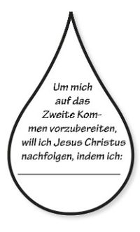 Regen Sie zur Anwendung an: Zeichnen Sie eine Lampe an die Tafel. Sprechen Sie darüber, dass wir sozusagen Öl in unsere Lampe gießen, wenn wir Jesus Christus nachfolgen, indem wir jeden Tag Gutes tun. Die Kinder sollen aufzählen, wie sie Jesus Christus nachfolgen können; zum Beispiel: indem sie anderen dienen, den Zehnten zahlen und beten. Erklären Sie, dass dies jeder selbst tun muss; das kann niemand sonst für uns tun. Geben Sie jedem Kind ein Stück Papier in der Form eines großen Tropfens Öl. Bitten Sie sie (oder ihren Lehrer), auf das Papier zu schreiben: „Um mich auf das Zweite Kommen vorzubereiten, will ich Jesus Christus nachfolgen, indem ich .“ Bitten Sie die Kinder, den Satz zu vervollständigen oder auf den Tropfen zu malen, was sie tun können, um sich auf das Zweite Kommen vorzubereiten. Fordern Sie die Kinder auf, ihren Papiertropfen mit nach Hause zu nehmen und ihrer Familie zu erzählen, was sie gelernt haben.